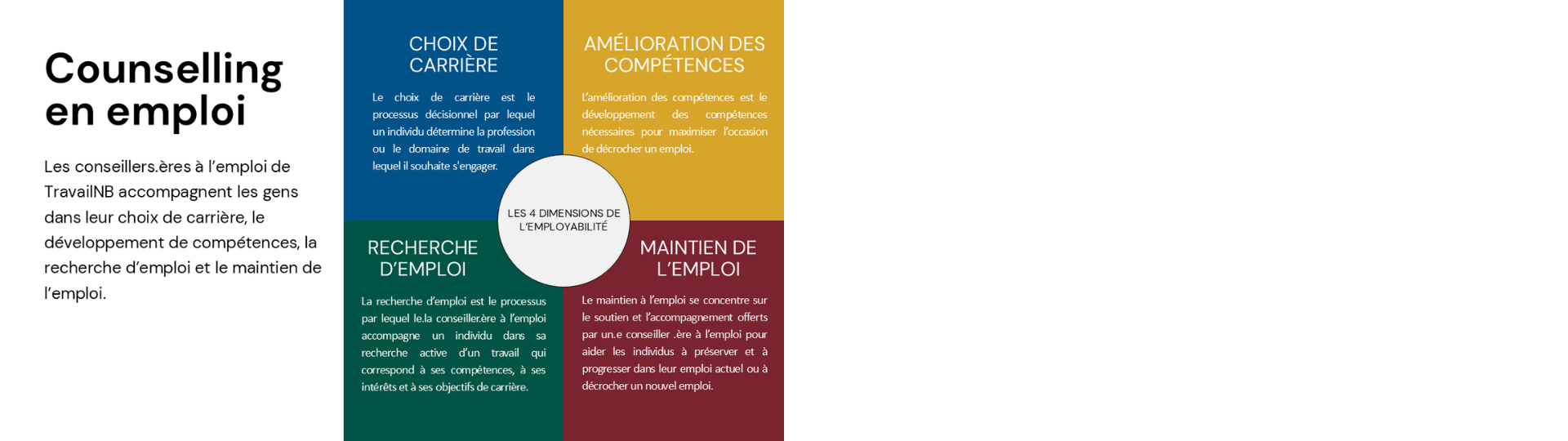 Les conseillers en emploi de TravailNB vous offrent un soutien pour vous aider à choisir une carrière, à perfectionner vos compétences et à trouver et conserver un emploi.